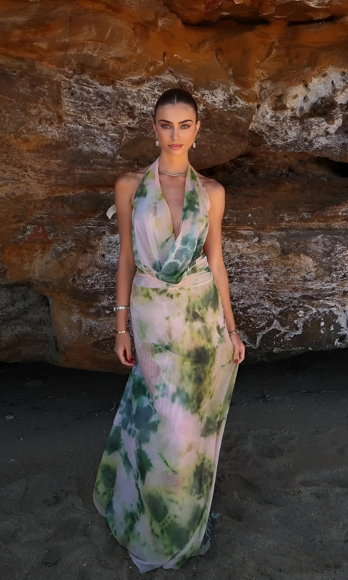 Tauche ein in die unvergleichliche Eleganz des EDEN Sets. Dieses atemberaubende Maxikleid vereint luxuriöse Stoffe mit einem einzigartigen Tie-Dye-Print und einem tiefen Wasserfallausschnitt. Das EDEN Set ist mehr als nur ein Zweiteiler – es ist ein Statement. Die Kombination aus sinnlichem Schnitt und kunstvollem Print macht es zu einem Highlight in jeder Garderobe.