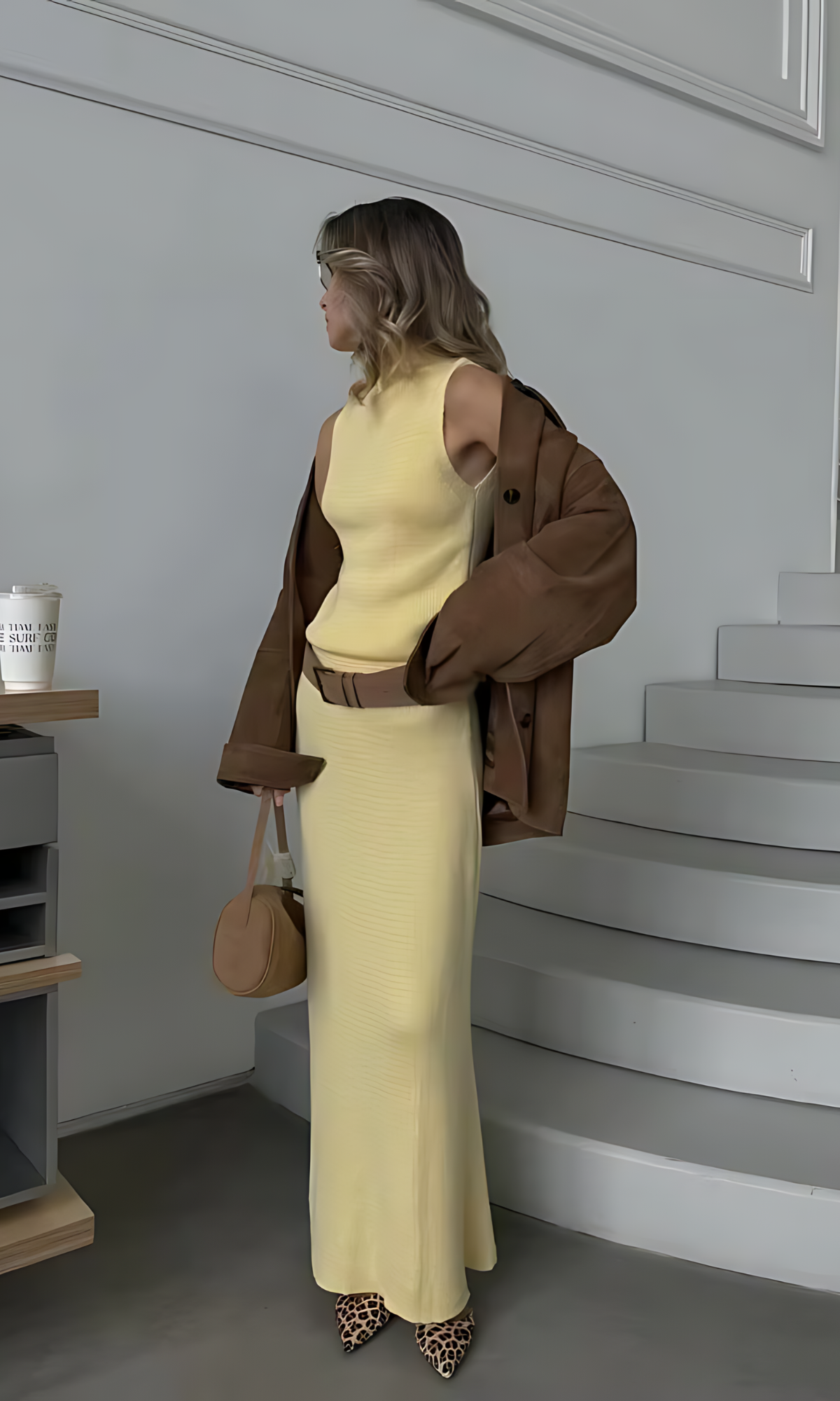 Das GRETA Knit Set ist die perfekte Kombination aus modernem Stil und gemütlichem Komfort. In der angesagten Trendfarbe Buttermilk, einem sanften, cremigen Gelbton, setzt das Set modische Akzente, die jedes Outfit aufwerten. Es besteht aus einem eleganten Rollkragen-Pullunder und einem perfekt abgestimmten Rock, der für eine feminine und moderne Silhouette sorgt. Der weiche Strickstoff fühlt sich angenehm auf der Haut an und bietet genau die richtige Balance zwischen Leichtigkeit und Wärme – ideal für die Übergangszeit.
