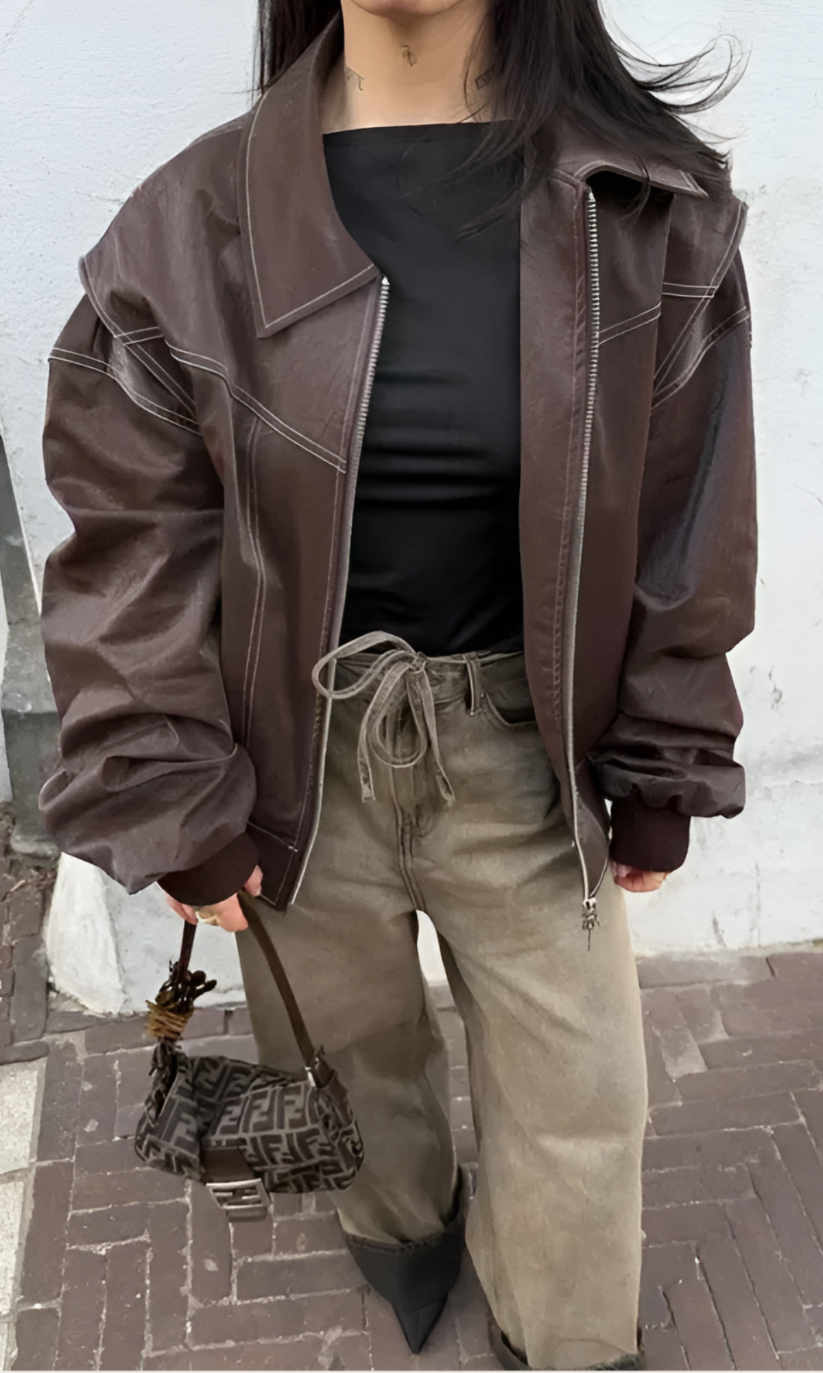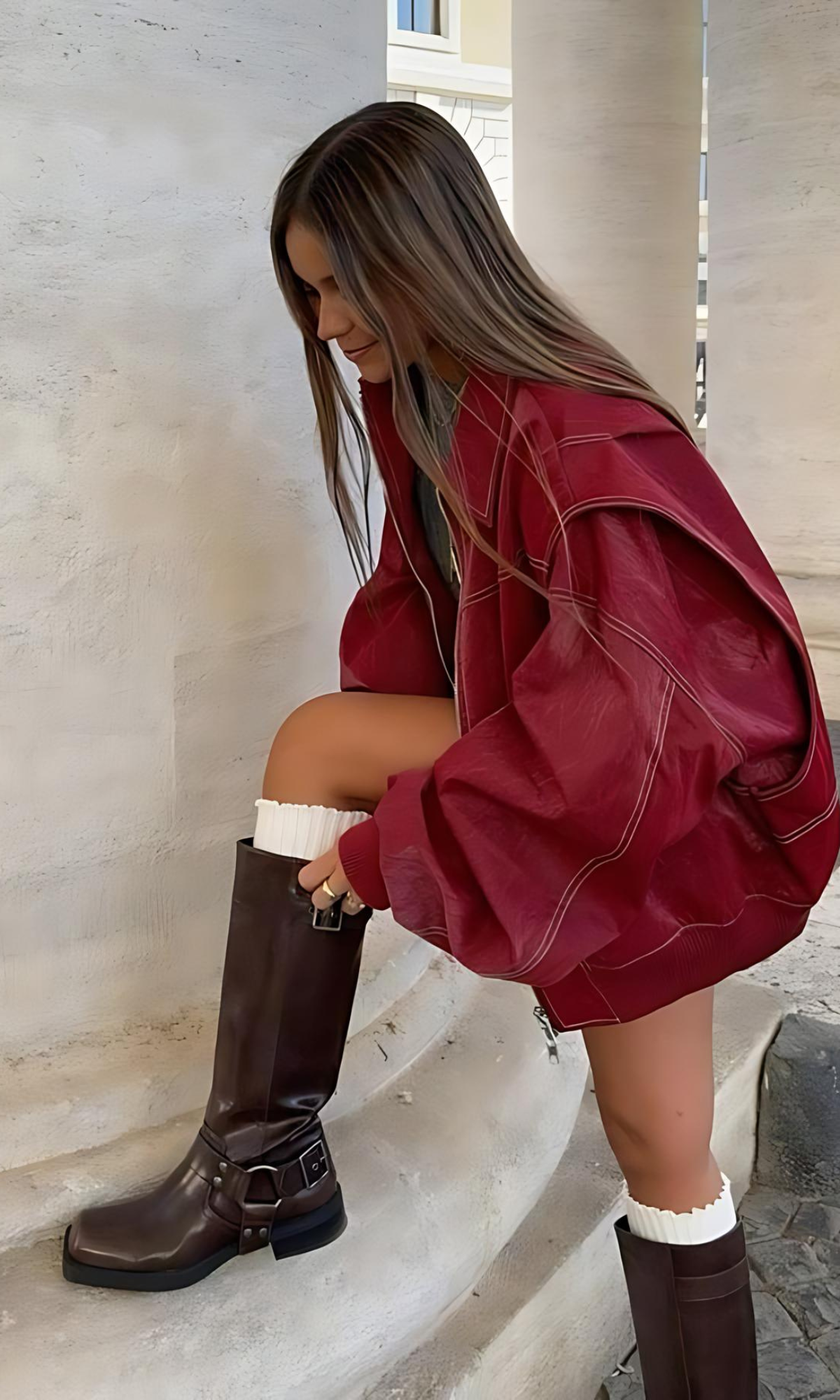 Kombiniere die JACKY Jacke mit einer Jeans und Sneaker für einen modernen Streetstyle-Look. Für einen eleganteren Auftritt kannst du die Jacke über einem eng anliegenden Kleid tragen und mit Boots oder Heels abrunden – so setzt du ein echtes Fashion-Statement!