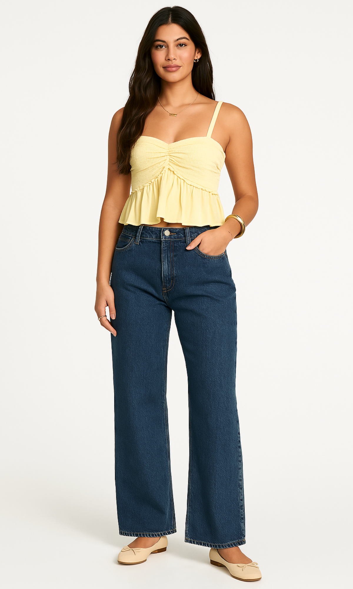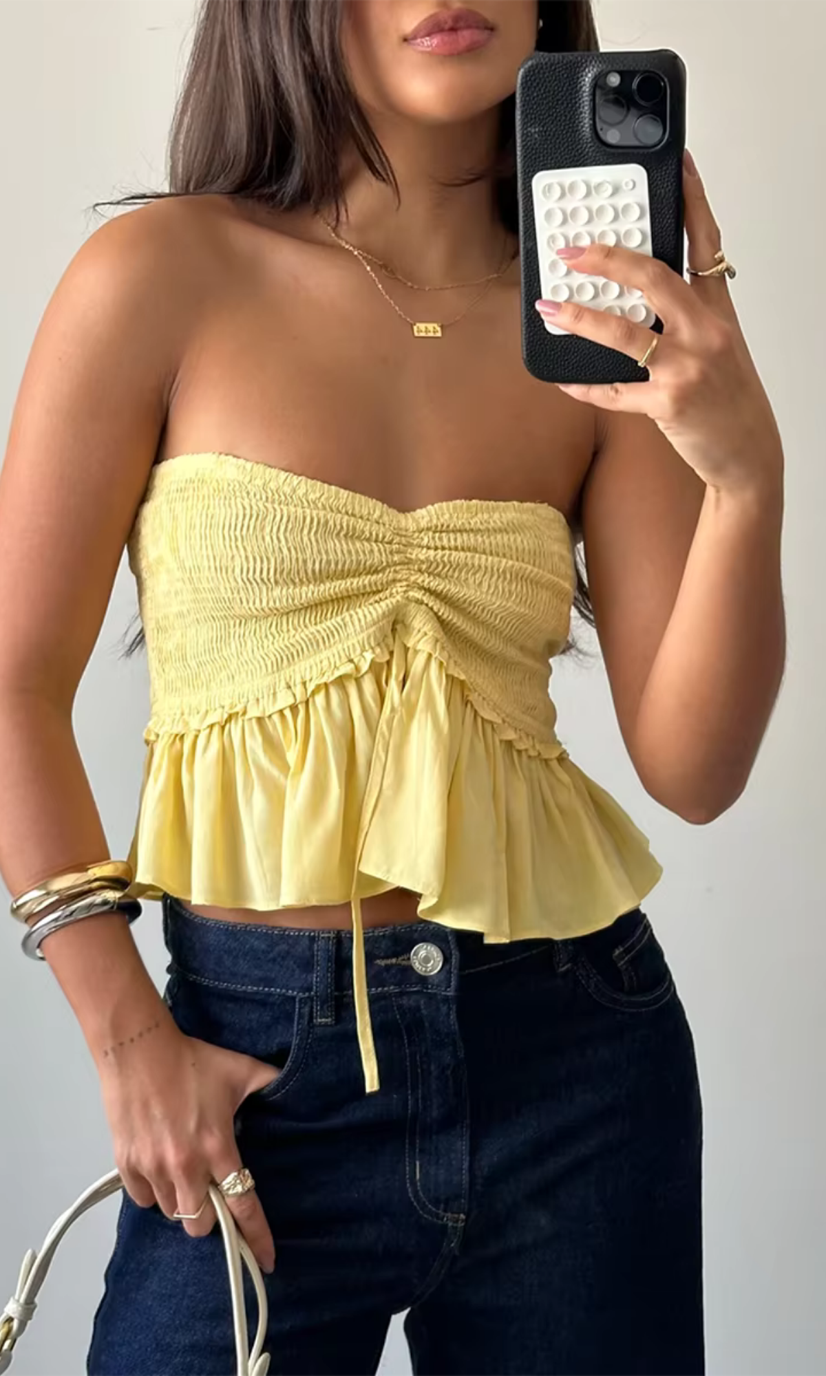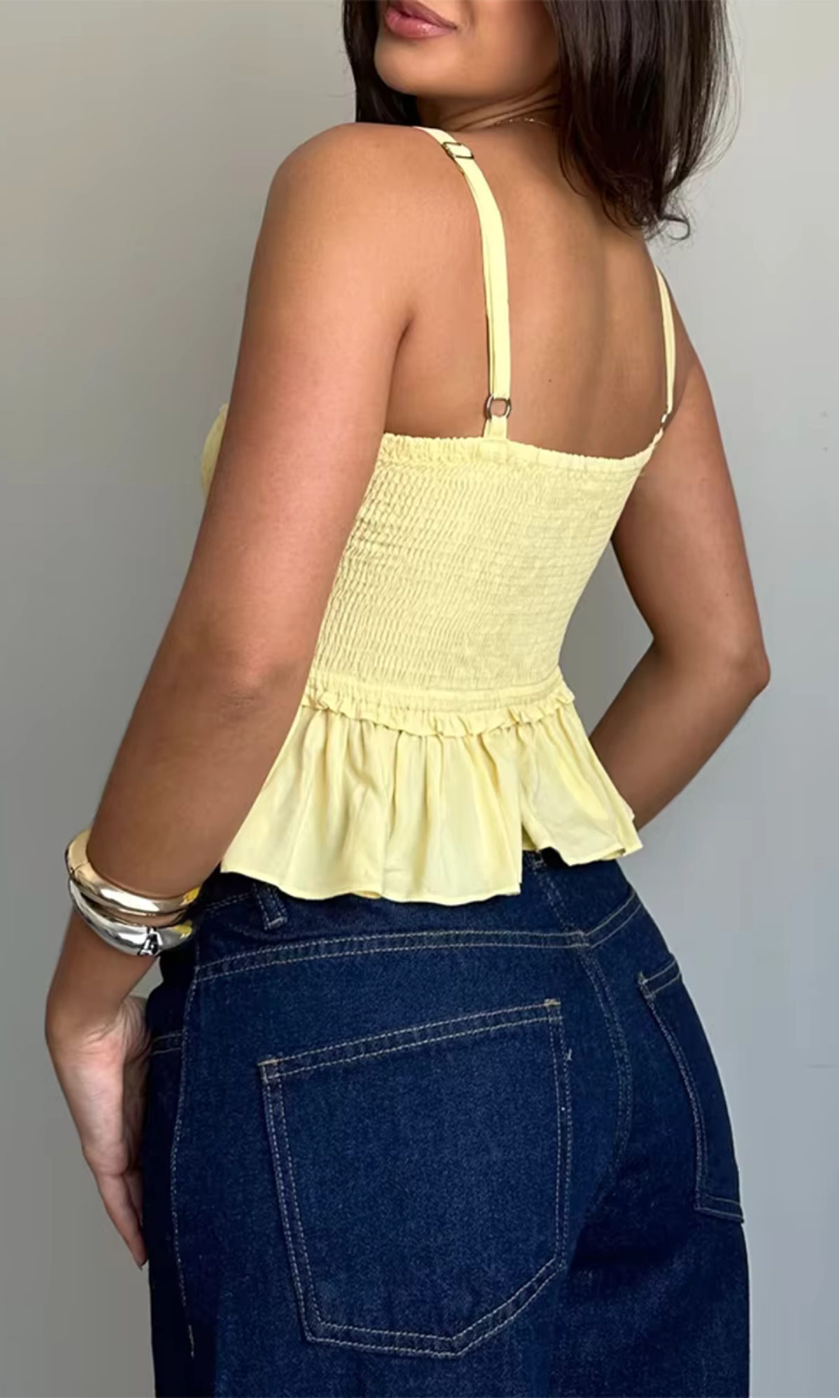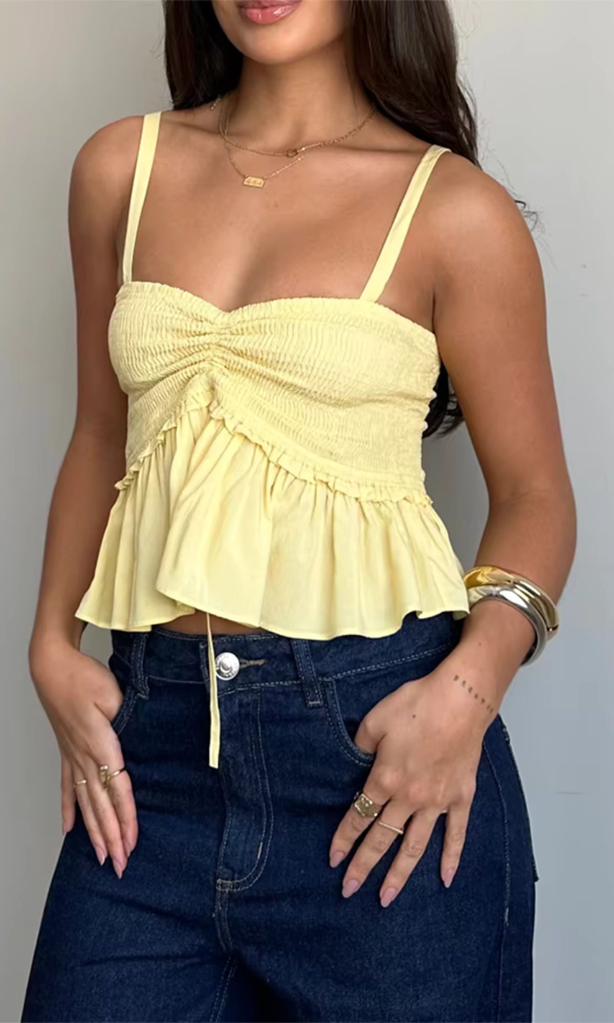 Unser Lamia Top in Butter Yellow strahlt pure Leichtigkeit aus. Der verspielte Rüschen-Saum trifft auf zarte Raffungen im Brustbereich – für einen Look, der gleichermaßen modern wie romantisch ist.