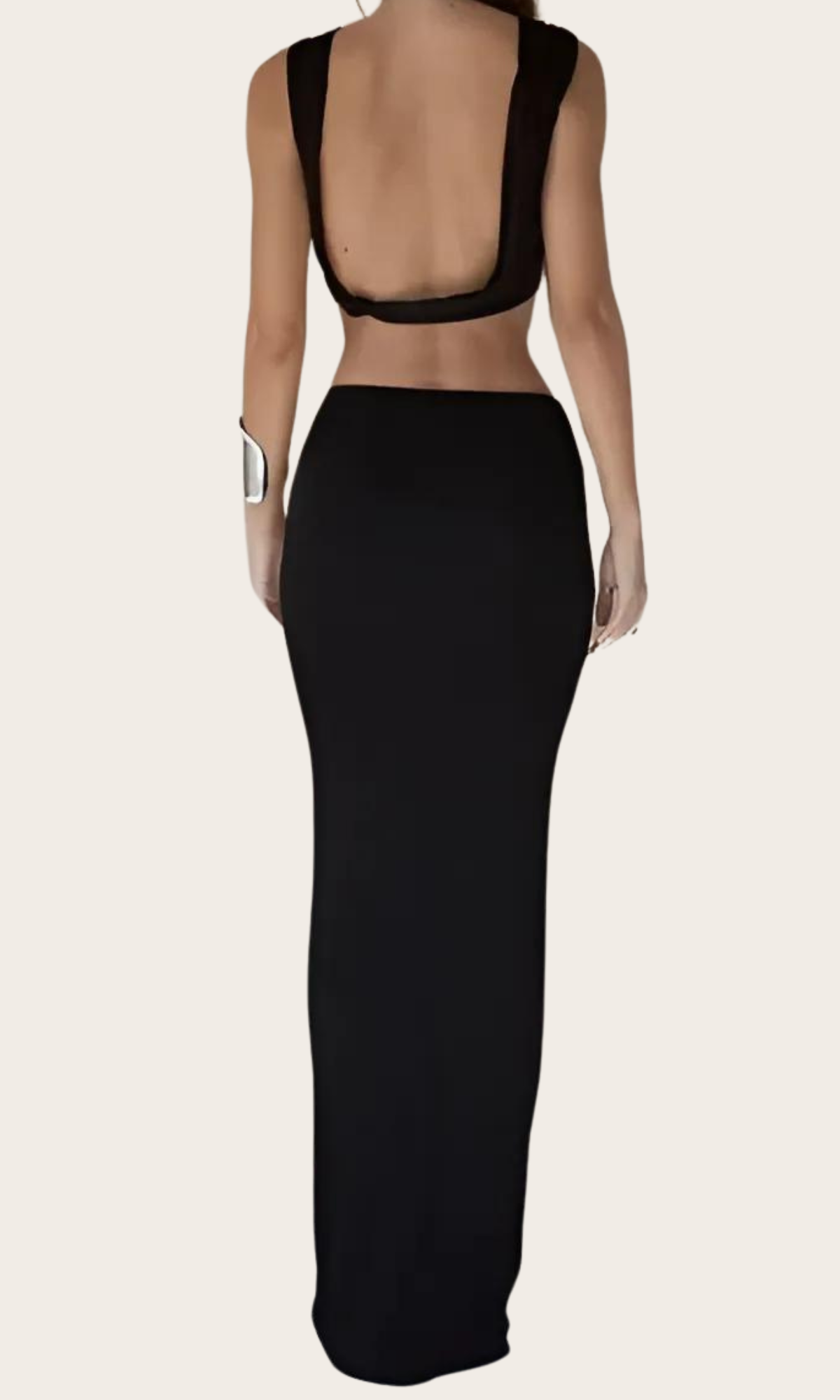 Design: Maxi-Rock (High-Waist oder Low-Waist tragbar und Top mit hohem Kragen und tiefem Rückenausschnitt