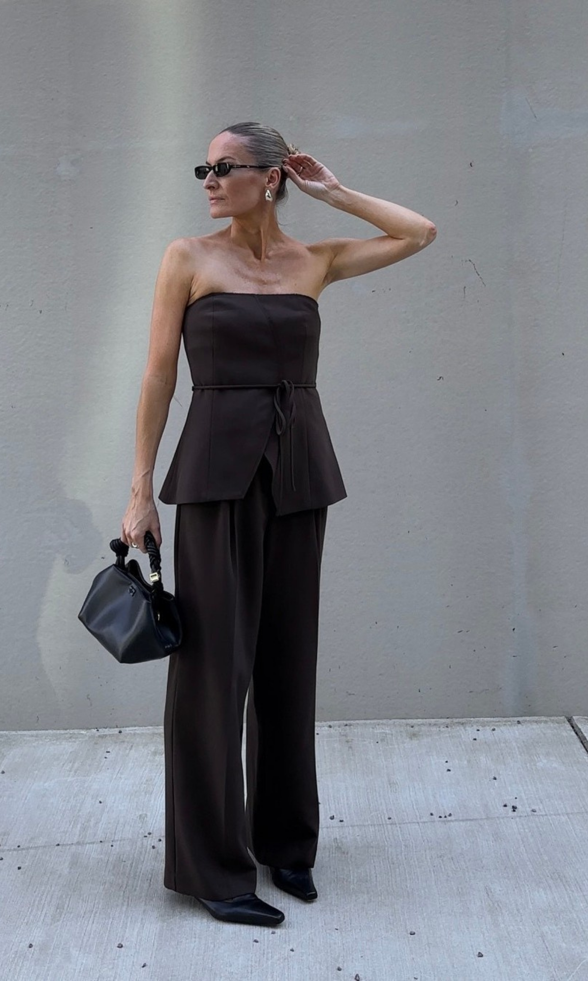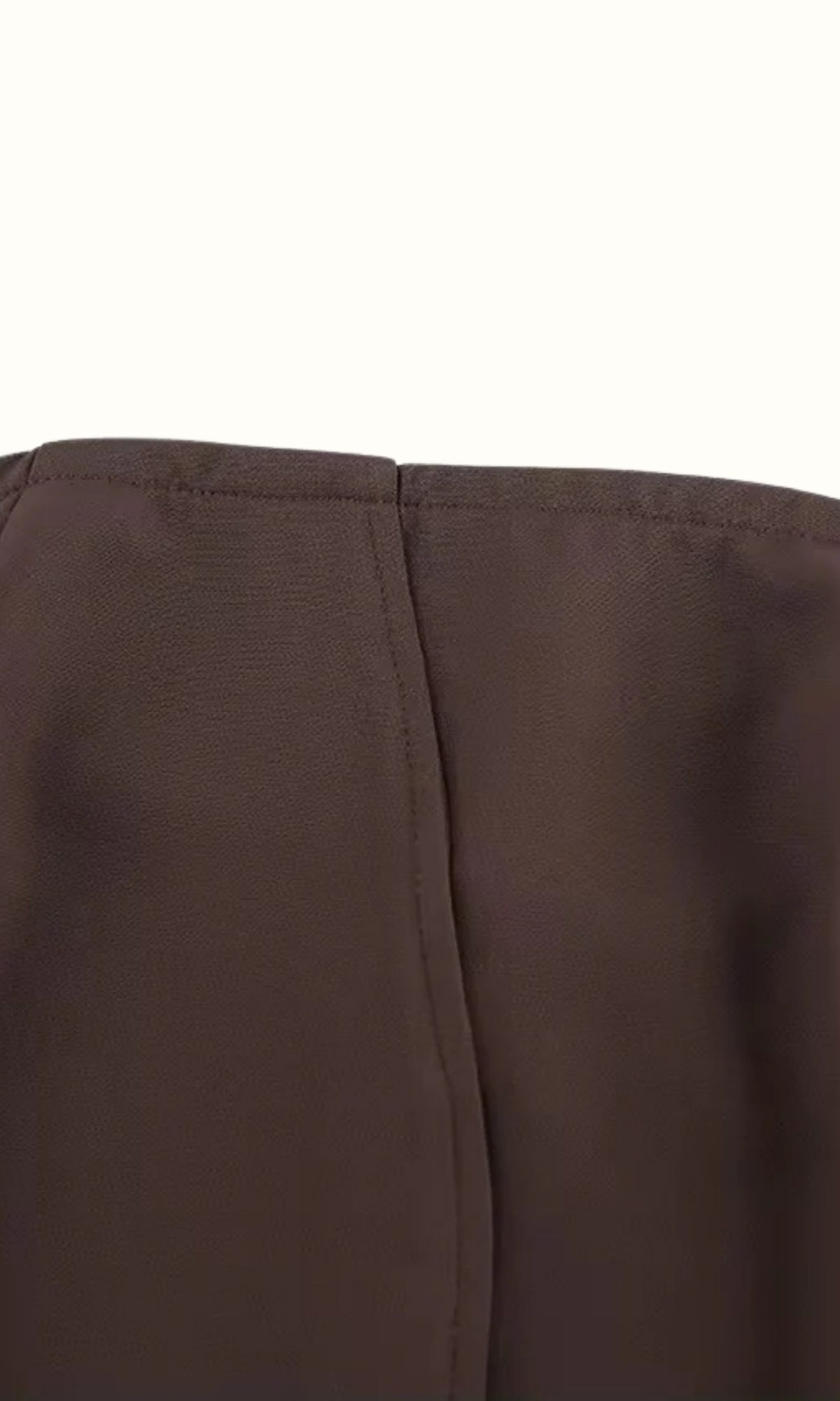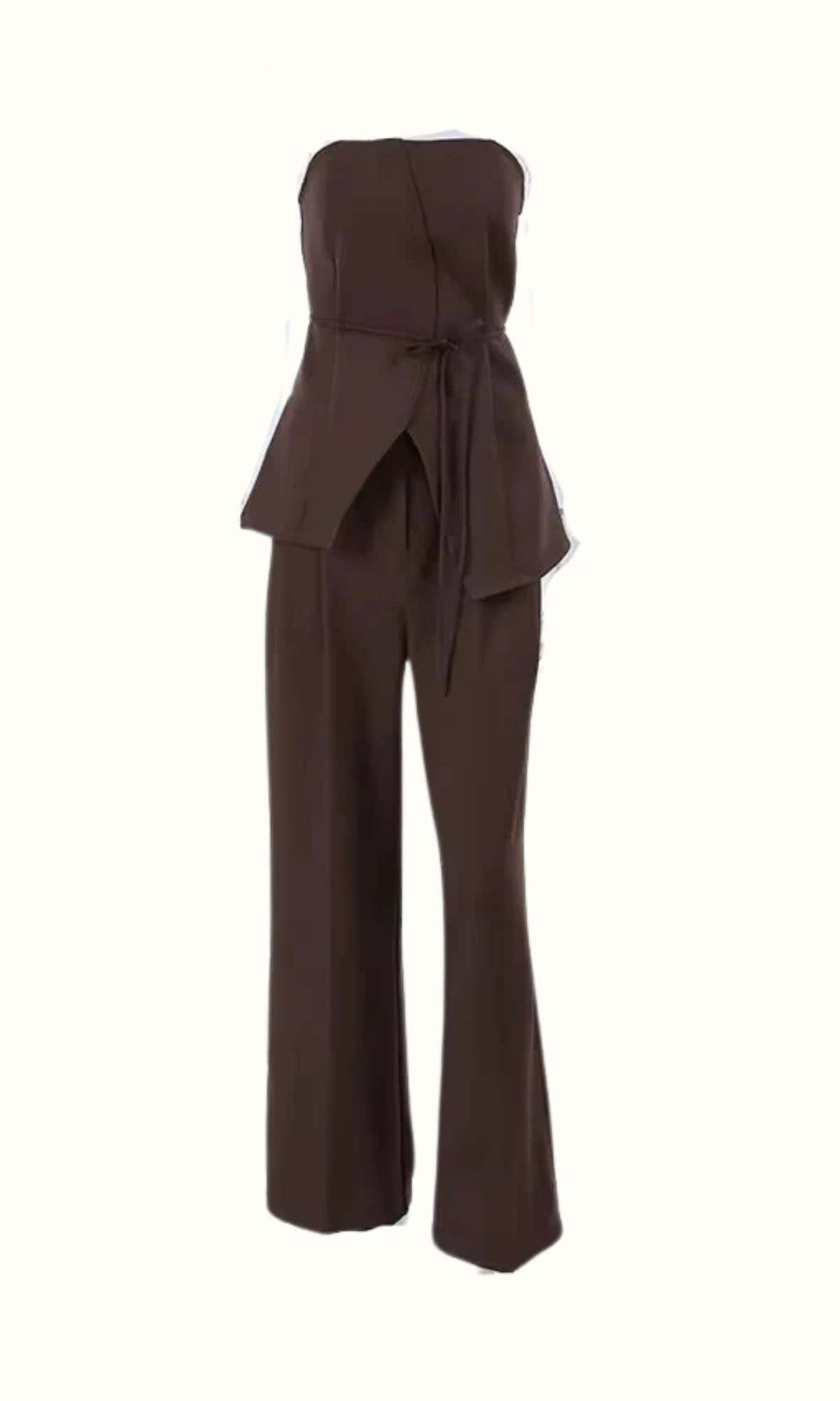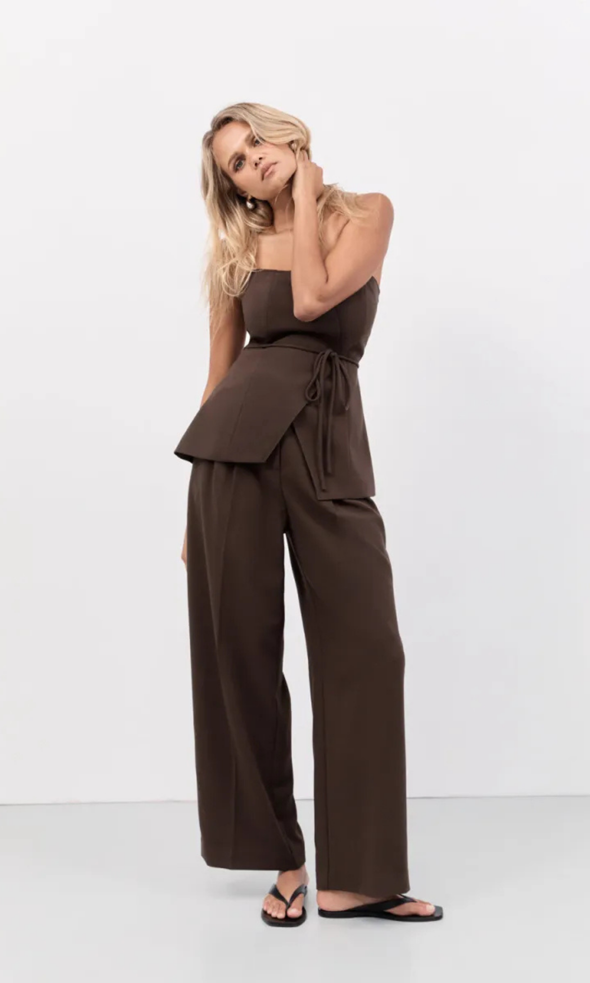 Braun ist die neue It-Farbe – und das Peppa Set bringt den Trend auf den Punkt. Ein schulterfreies Bandeau-Top trifft auf eine lässige Wide-Leg-Hose in sattem Schokobraun. Minimalistisch, aber mit maximaler Wirkung.