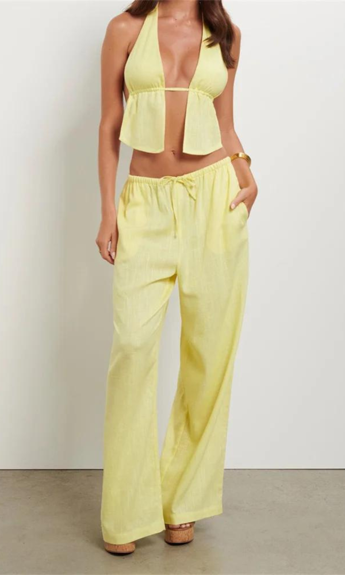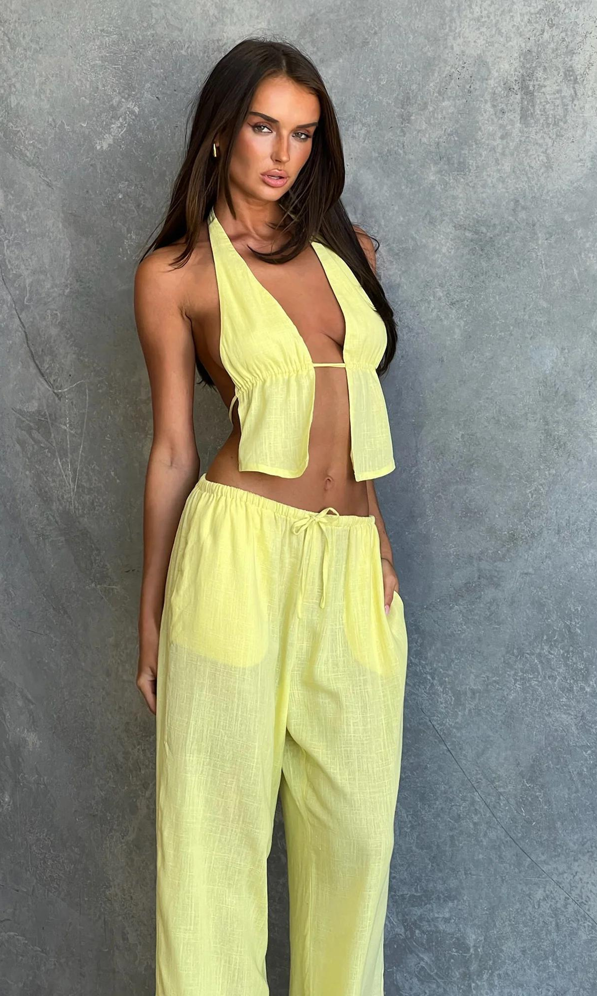 Design: Auffälliges gelbes Top zum Binden und eine tief sitzende Hose zum Schnüren