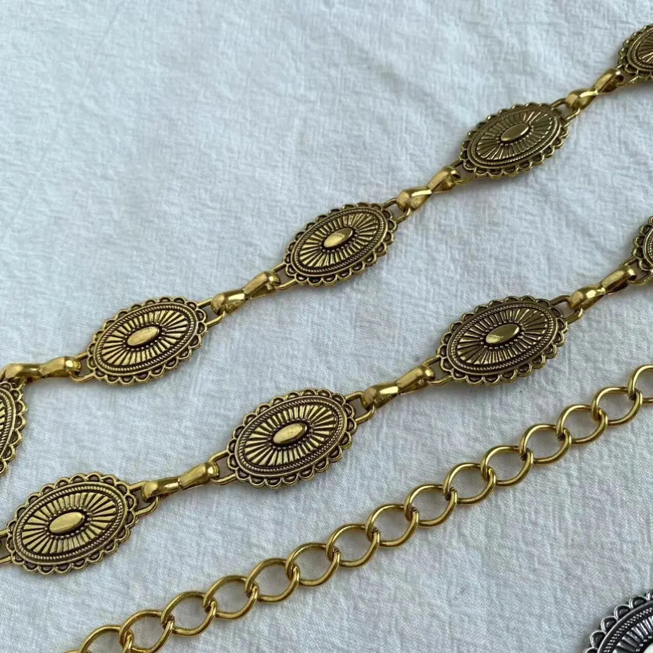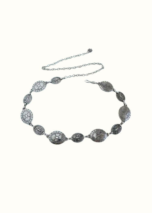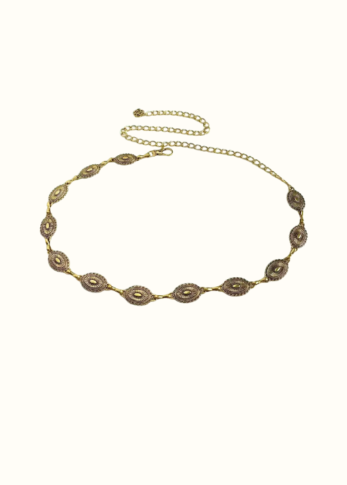Der wunderschöne retro Western Chainbelt: AMELIA. Dieser feine und elegante Gürtel lässt sich vielseitig kombinieren – trage ihn für einen authentischen Western-Look oder als stilvolles Accessoire über einem Sommerkleid bei einem eleganten Abendevent.