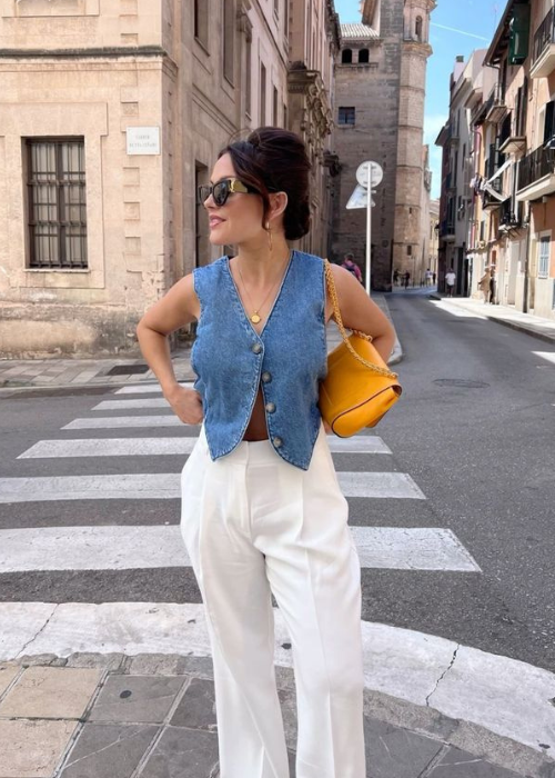 Die Rarely Neuheit: die EMMA Denim Weste. Sie ist unglaublich leicht zu stylen und passt zu eleganten Anzughosen, zu Jeans oder auch zu Röcken.